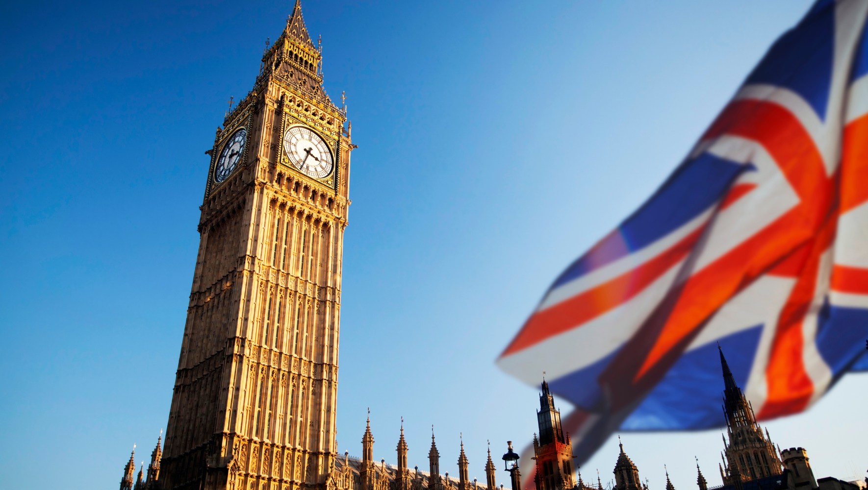 A view of Big Ben and the Houses of Parliament behind a transparent Union Jack